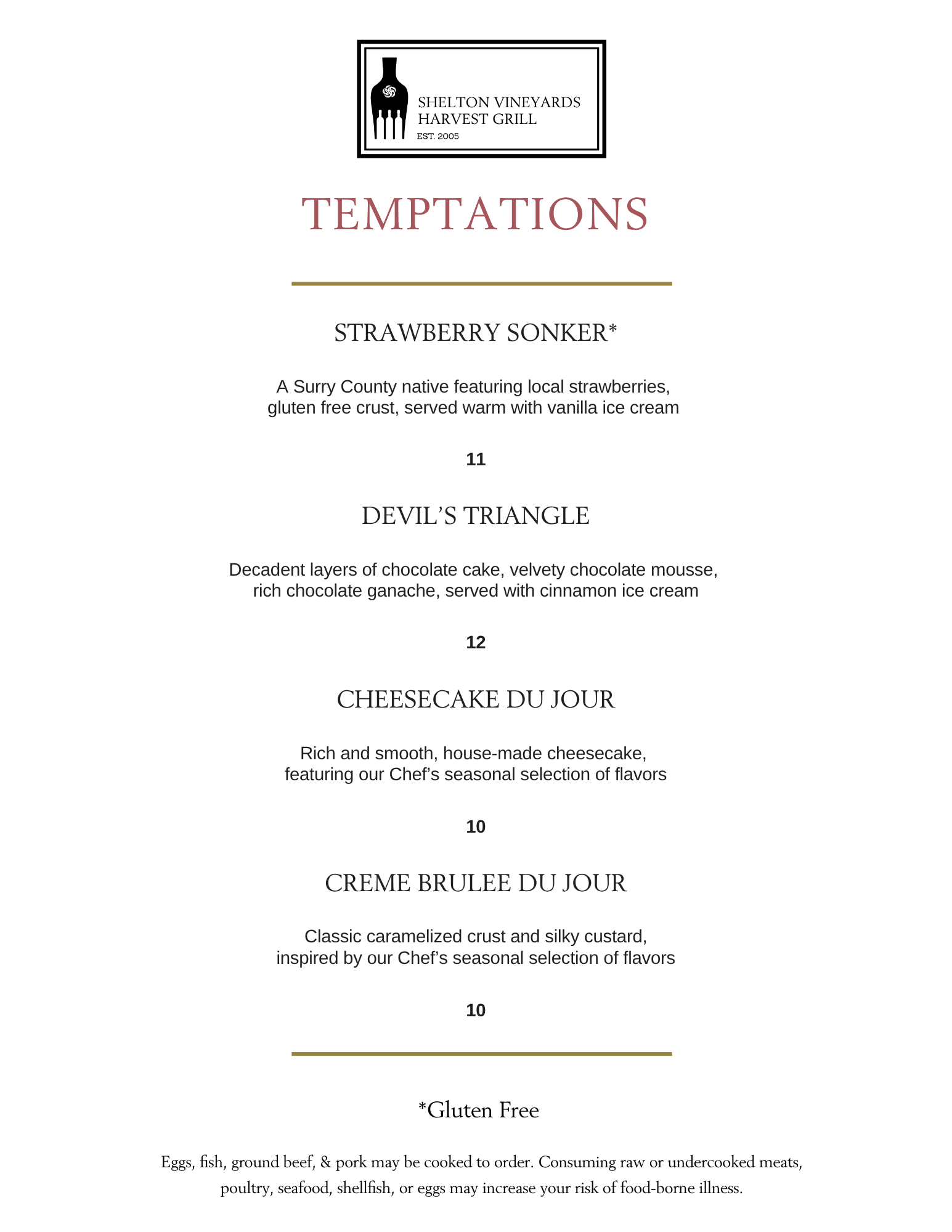 Located on the Shelton Vineyards estate, Harvest Grill is a refined yet relaxed farm-to-fork restaurant featuring locally sourced ingredients, seasonal flavors, and expertly paired wine selections. Dine inside or on the patio surrounded by vineyard views.